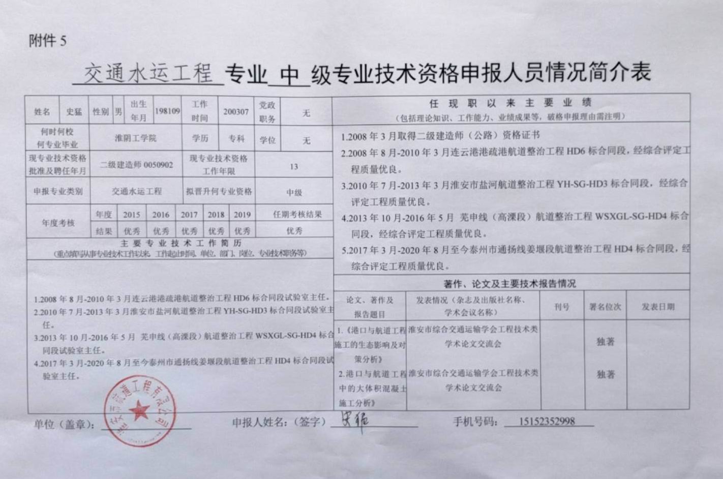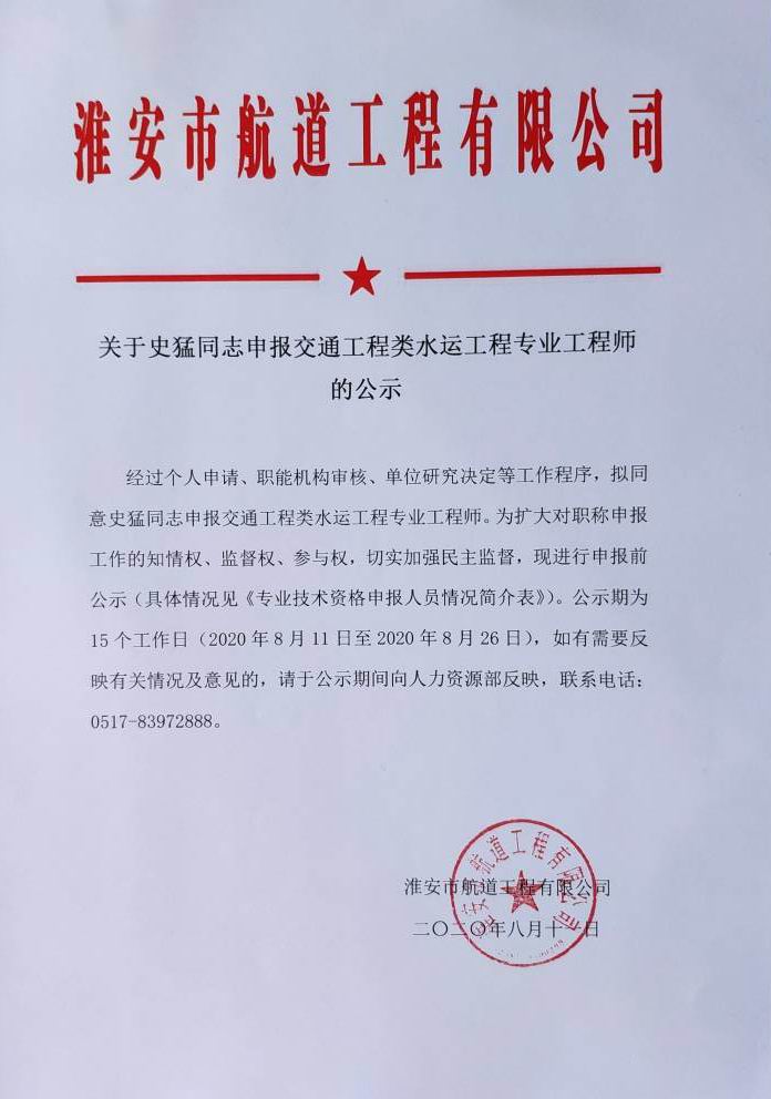關(guān)于史猛同志申報交通工程類(lèi)水運工程專(zhuān)業(yè)工程師的公示